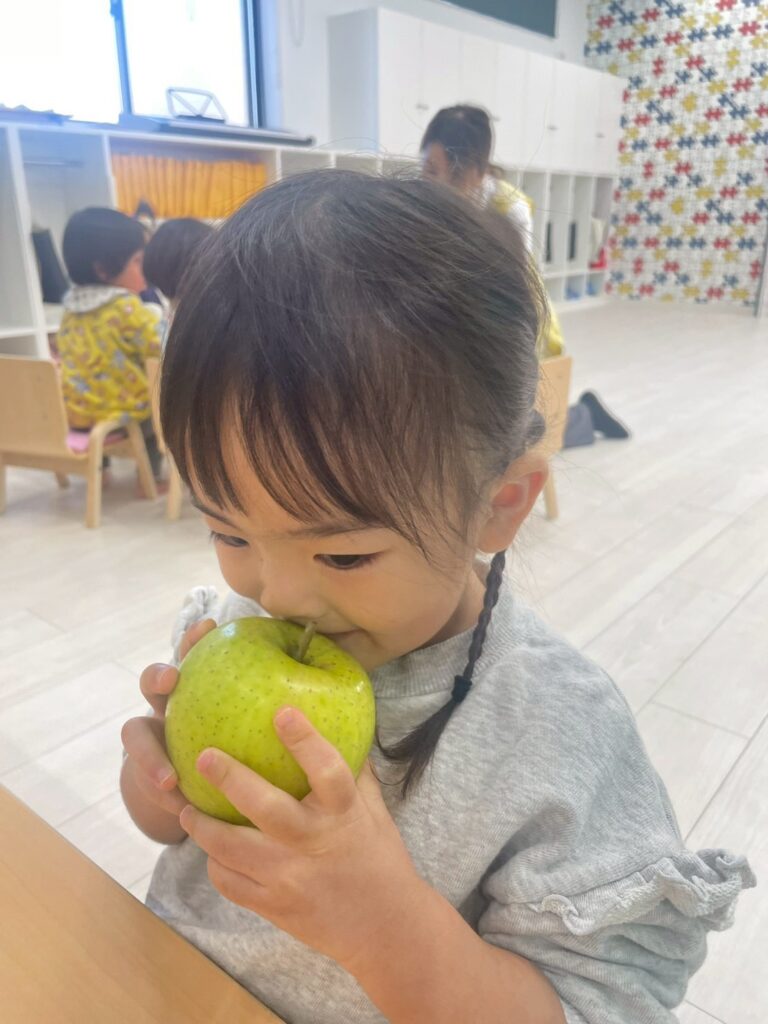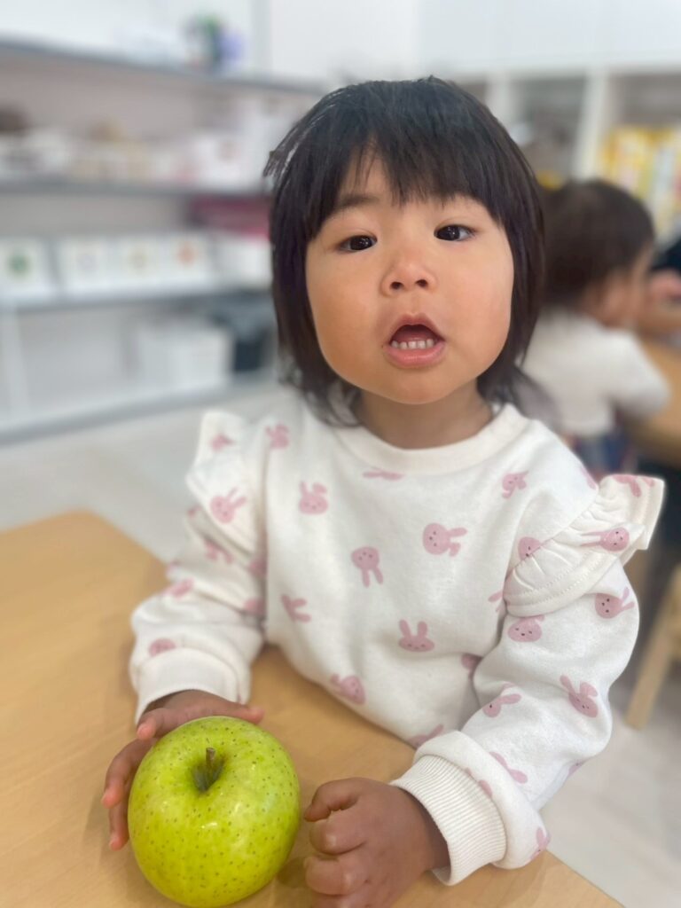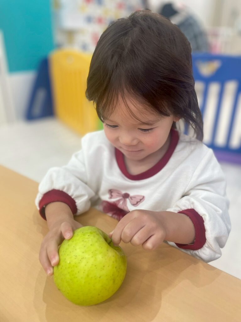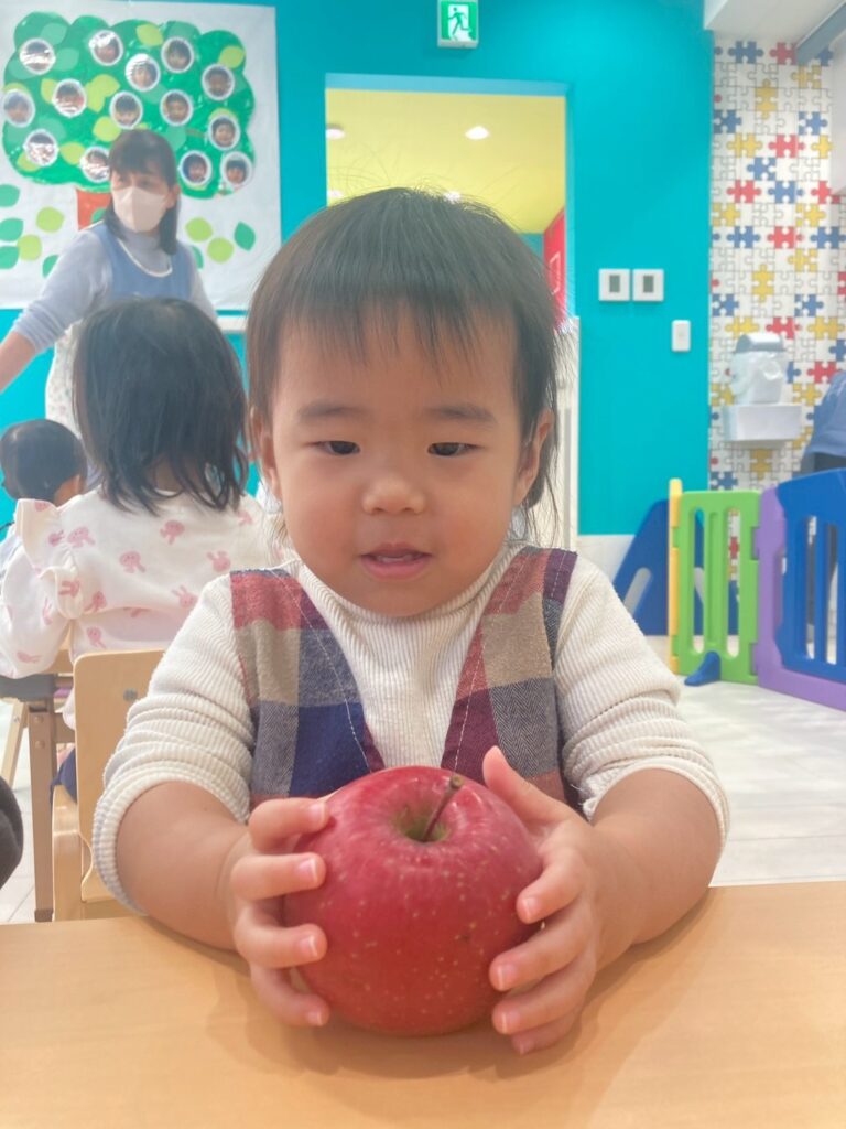 子どもたちは実際のりんごを見たり匂いをかいだり手でもって重さを感じたり