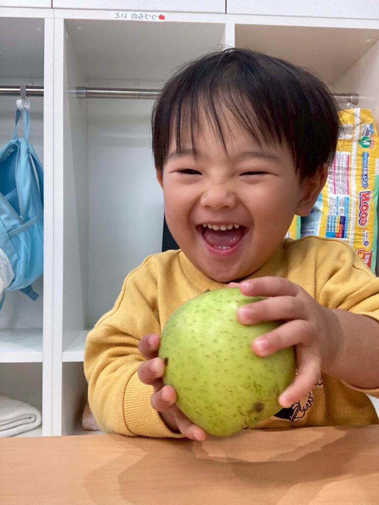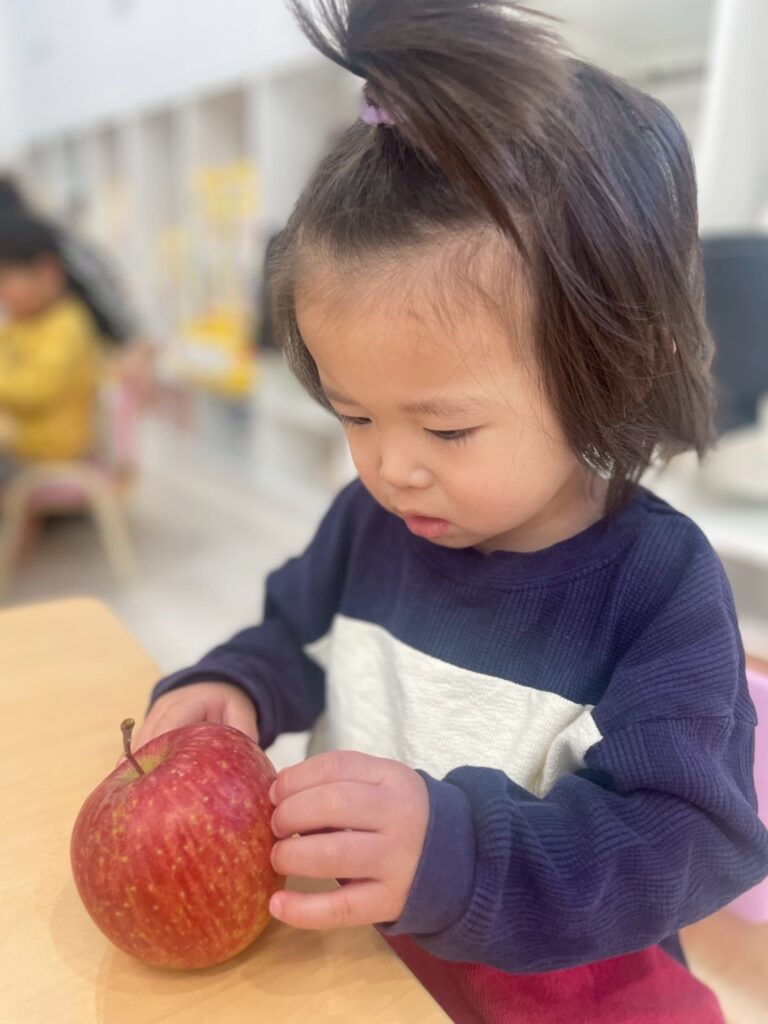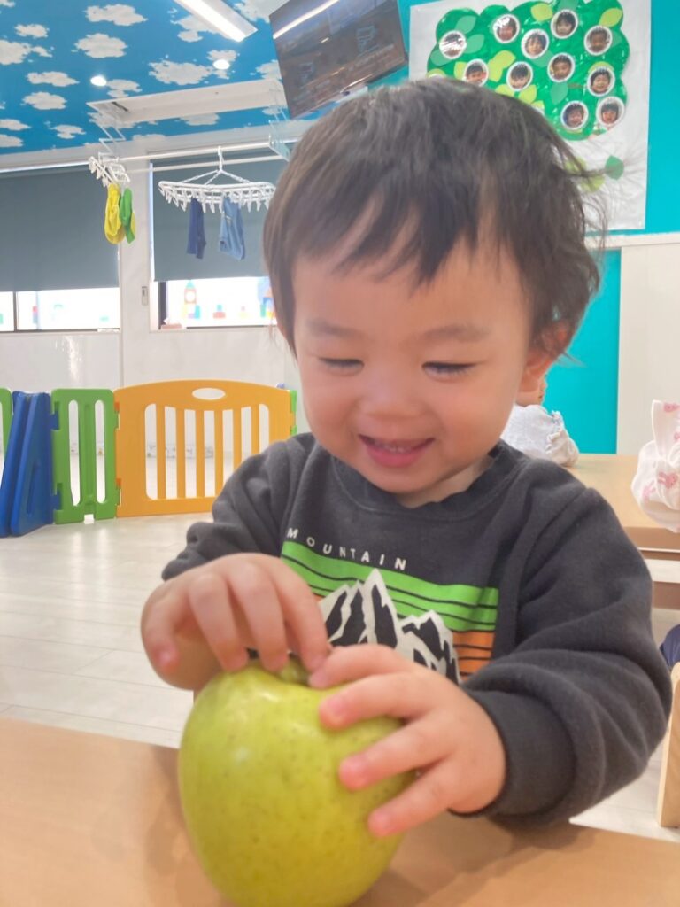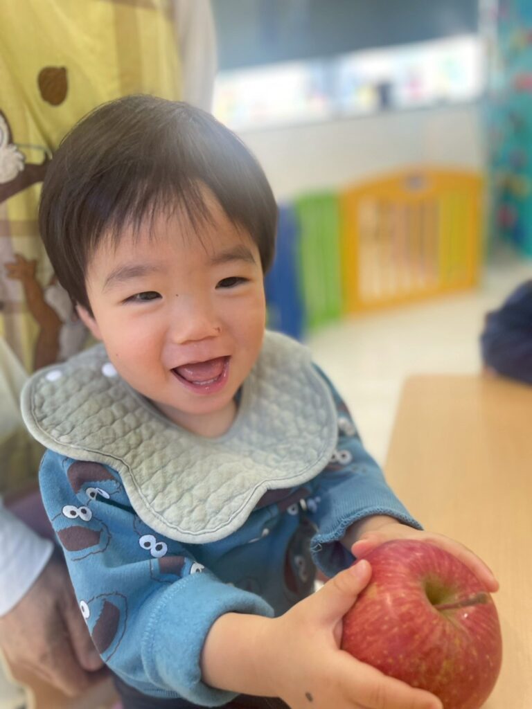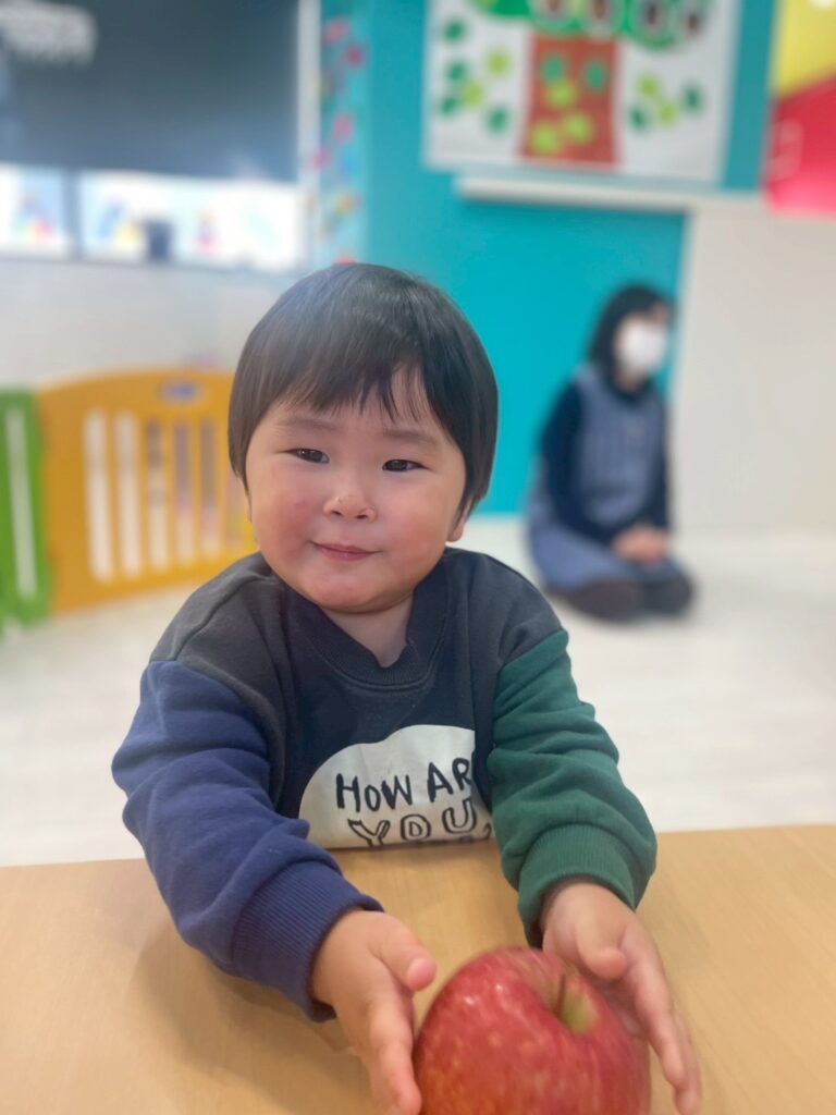 子どもたちは実際のりんごを見たり匂いをかいだり手でもって重さを感じたり